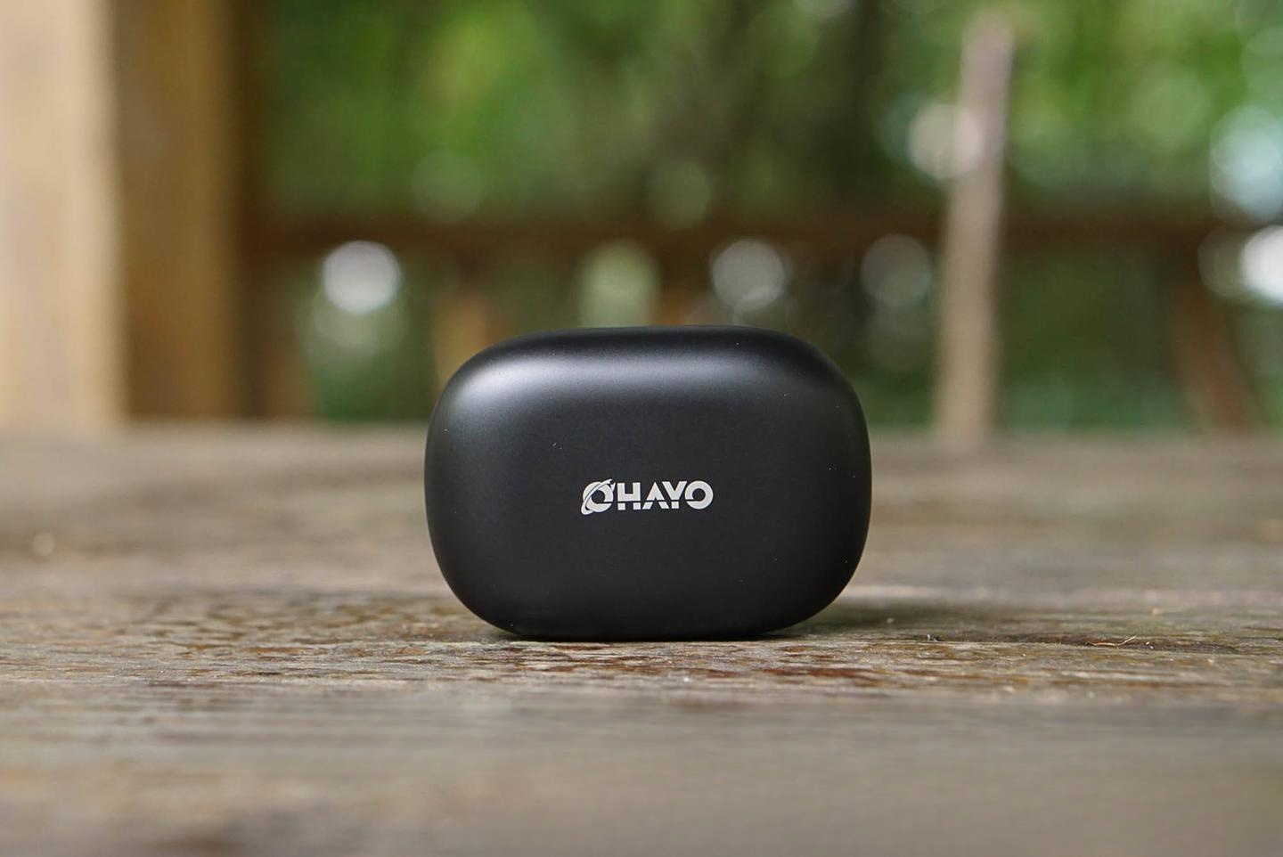 二是外观方面:雷登T10耳机的收纳盒采用了黑色的磨砂外壳设计,收纳盒正面刻有OHAYO的LOGO,显得很简约大方。收纳盒的外形像是一颗椭圆形的鹅卵石,体积也和一个鸡蛋差不多,拿在手上的感觉很舒服。